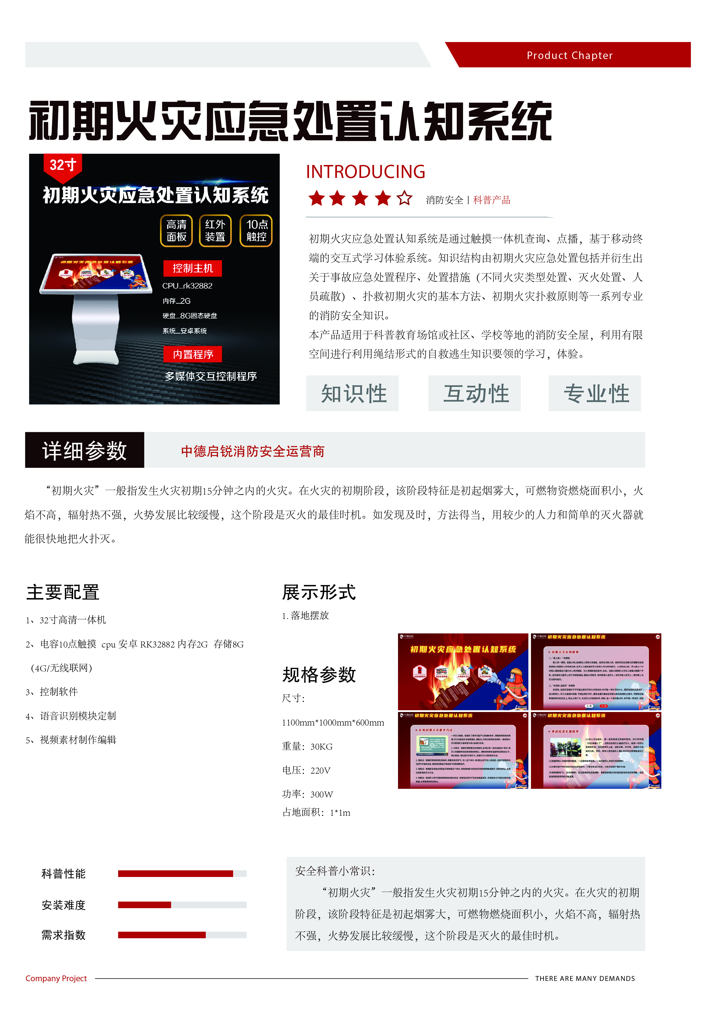 初期火灾应急处置认知系统是通过触摸一体机查询、点播,基于移动终端的交互式学习体验系统。知识结构由初期火灾应急处置包括并衍生出关于事故应急处置程序、处置措施(不同火灾类型处置、灭火处置、人员疏散)、扑救初期火灾的基本方法、初期火灾扑救原则等一系列专业的消防安全知识。 本产品适用于科普教育场馆或社区、学校等地的消防安全屋,利用有限空间进行利用绳结形式的自救逃生知识要领的学习,体验。