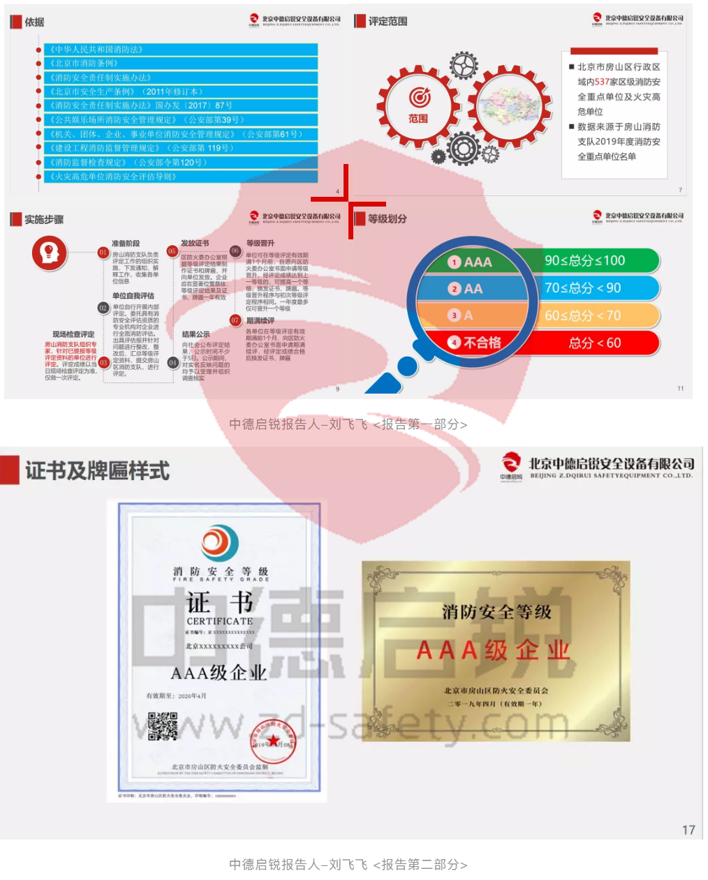 北京中德启锐安全设备有限公司受邀至会议做房山区消防安全等级评定工作汇报,并对第三方消防安全风险评估工作进行详述及开展专项培训主题报告;