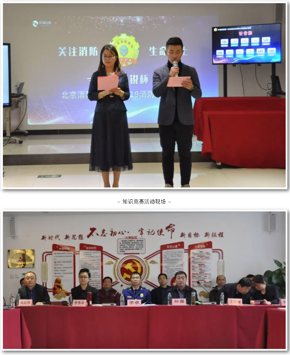 活动参赛代表队围绕消防法律法规、消防安全制度和保障消防安全的操作规程;单位和岗位的火灾危险性和防火措施;消防设施的性能、灭火器材的使用方法;报火警、扑救初起火灾及自救逃生的知识和技能;家庭防火常识和家用灭火、逃生器材的使用方法等消防安全知识内容通过个人必答题、小组必答题、抢答题、风险题等环节展开激烈的角逐。 活动开始前由北京中德启锐安全设备有限公司马达伟先生发言并表示,感谢前来参加“中德启锐杯”北京消防协会首届119消防知识竞赛公益活动的专家评委给与竞赛的专业指导,并预祝此次活动圆满成功。 随后由北京消防协会会长孙富会长宣布:”北京消防协会“中德启锐杯首届119消防知识竞赛活动正式开始。